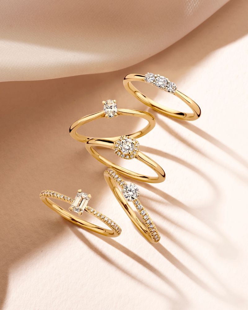 Verfijnde gouden damesring met sprankelende diamanten. De ring bevat een opvallende baguette geslepen diamant en voor optimale schittering is ook de band van de ring gezet met diamantjes.