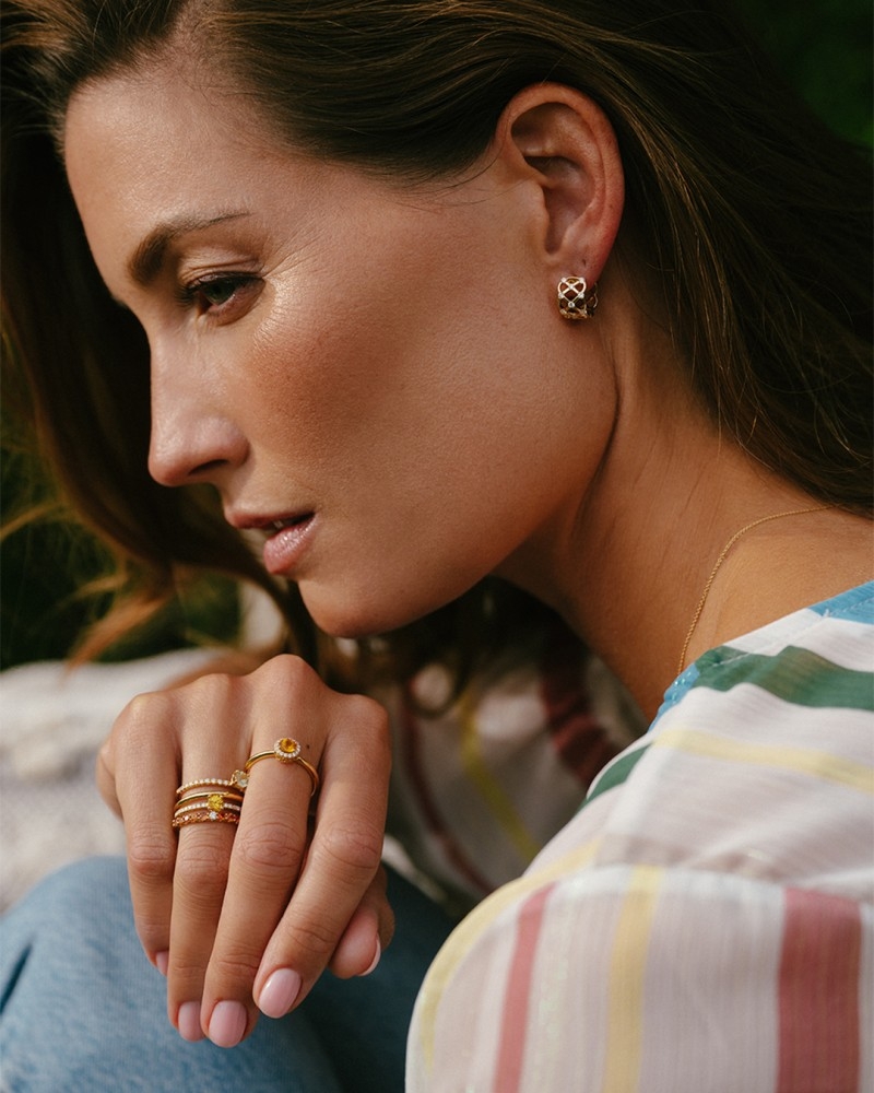 Stijlvolle 18kt geelgouden rijring met tien oranje saffieren en een witte briljant als stralend middelpunt.