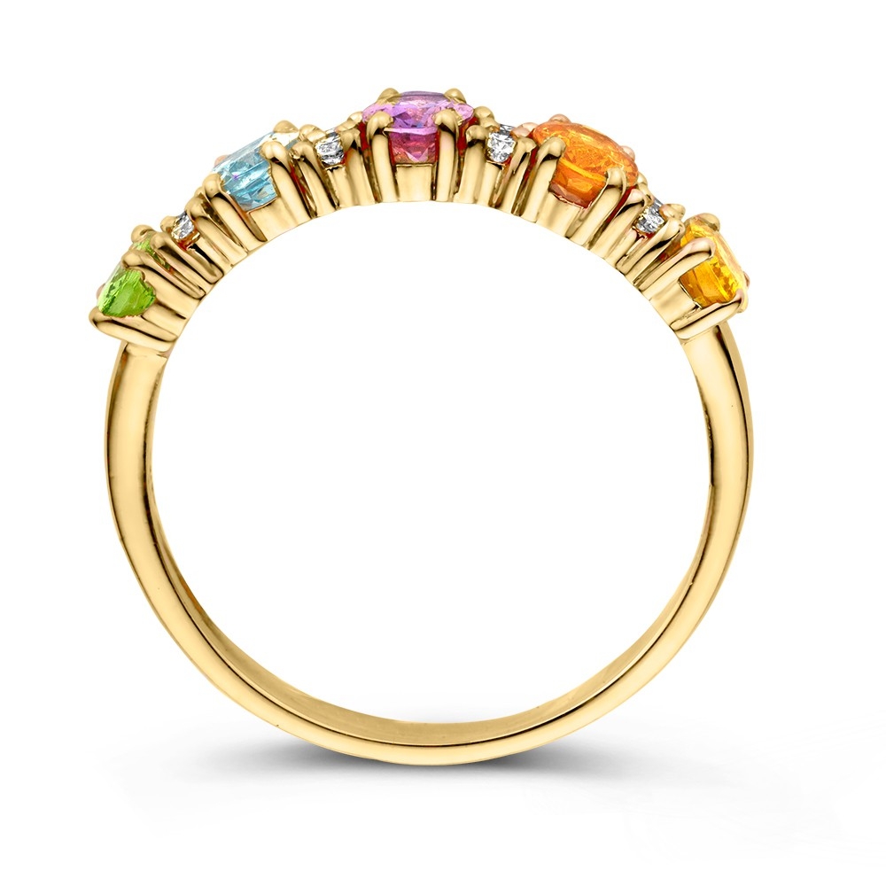 Bijzondere roségouden rijring met ovale saffieren in verschillende kleuren. Tussen deze rainbow sapphire edelstenen door zijn fonkelende briljanten geplaatst, waardoor de ring een schitterende en luxe uitstraling heeft.