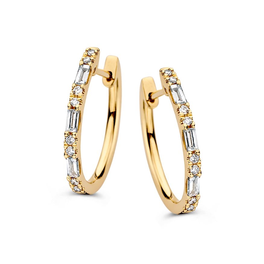 Luxe gouden oorringen gezet met briljant en baguette geslepen diamanten. Een plaatje in het oor!